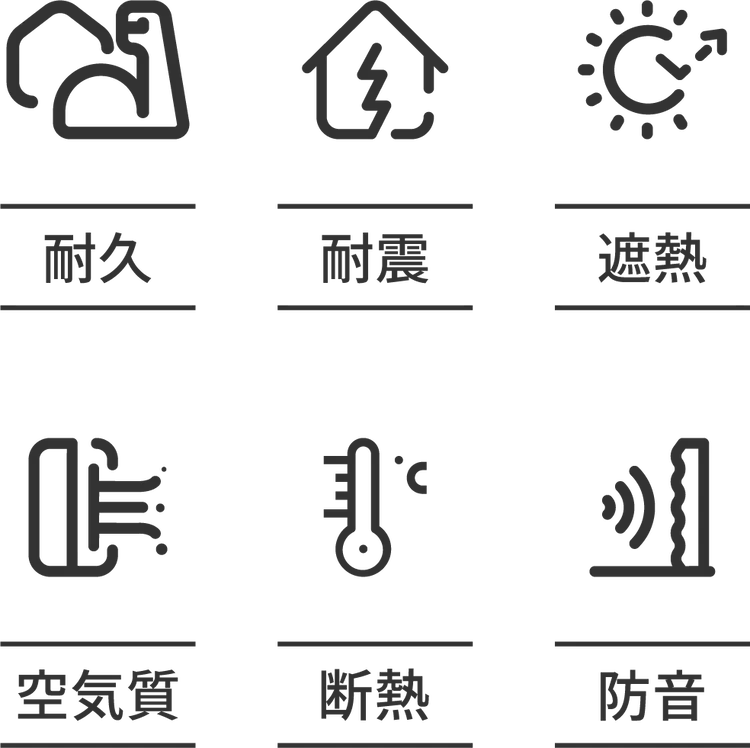 健康・快適・安心・安全な暮らしを実現する機能・性能を目指します。長く安心・安全に暮らすための「耐震」「耐久」や、健康・快適な暮らしに欠かせない「断熱」「遮熱」「空気質」「防音」。思い描いた理想の暮らしを高い品質と技術力で、住宅の性能を向上させて実現します。