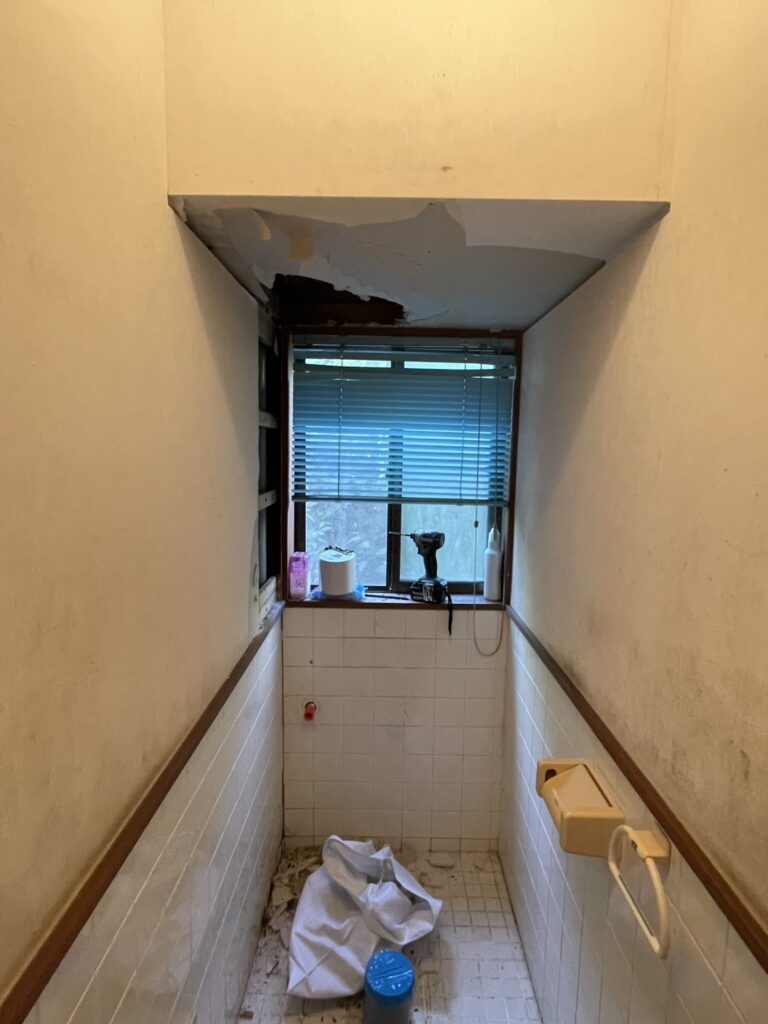 トイレの天井はかなり下地が痛んでいたため、大工さん2人で下地の補修もして頂きました。