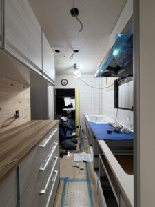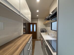 キッチンが狭く、収納も少なかったので、物が出しっぱなしになっていました。また、古いキッチンで掃除がしにくく、調理スペースが狭いのも日々のストレスになっていました。